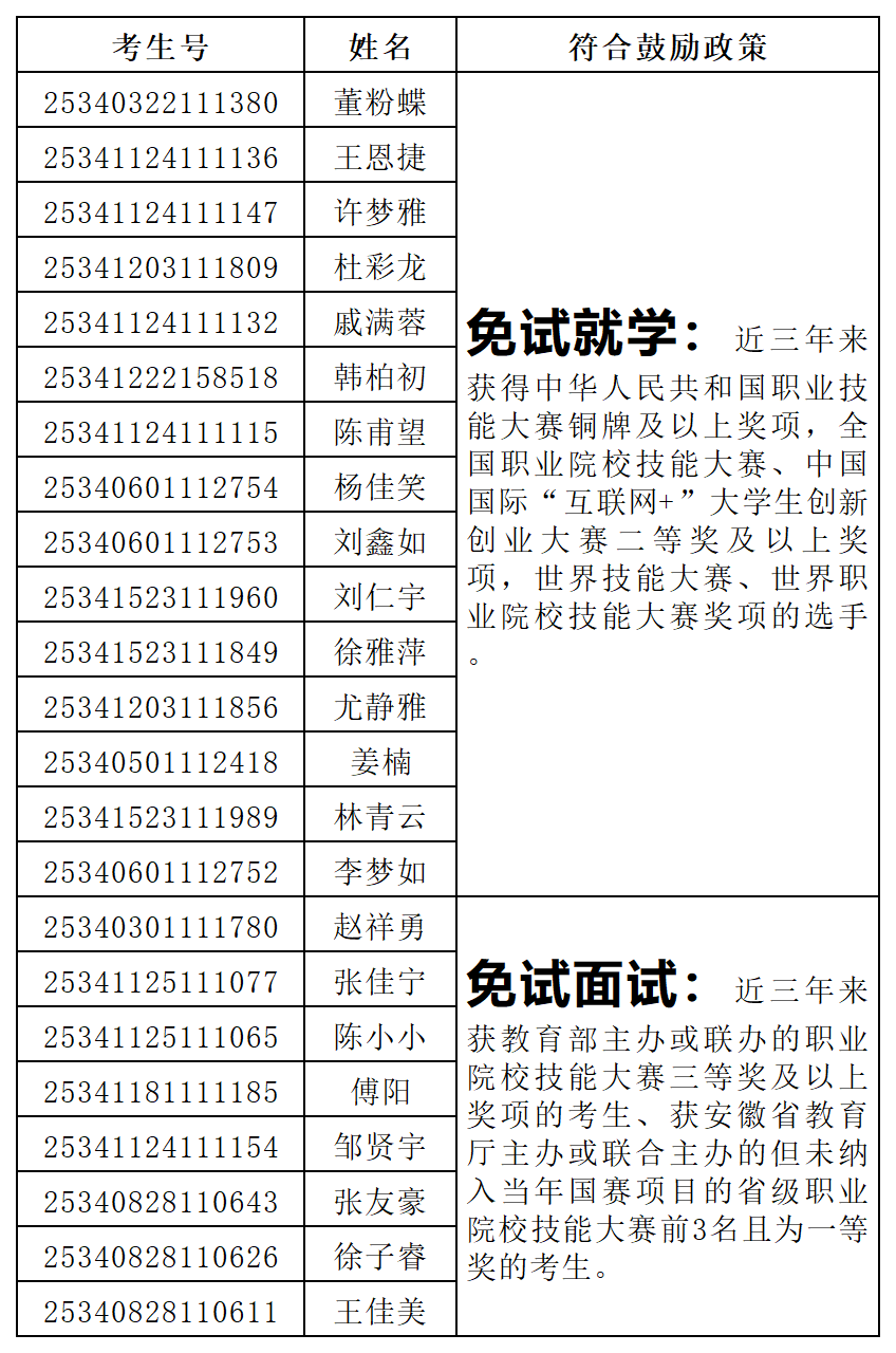 根据《350vip浦京集团官网2025年面向中职毕业生对口招生章程》关于申请免试就学、免试面试和加分鼓励政策的相关要求,经考生申请,学校审核,共有董粉蝶等15名考生符合免试就学政策,赵祥勇等8名考生符合技能大赛免试面试政策,无符合考试加分政策考生,现对符合相关鼓励政策的考生信息予以公布。免试就学资格复审和免试面试具体安排见招生与就业工作处网站“招生服务”栏“350vip浦京集团官网2025年对口招生考试免试就学资格复审和免试面试工作通知”。如有异议或遗漏,请于3月19日17:00前联系350vip浦京集团官网招生办公室:0550-6732041,0552-3197041。